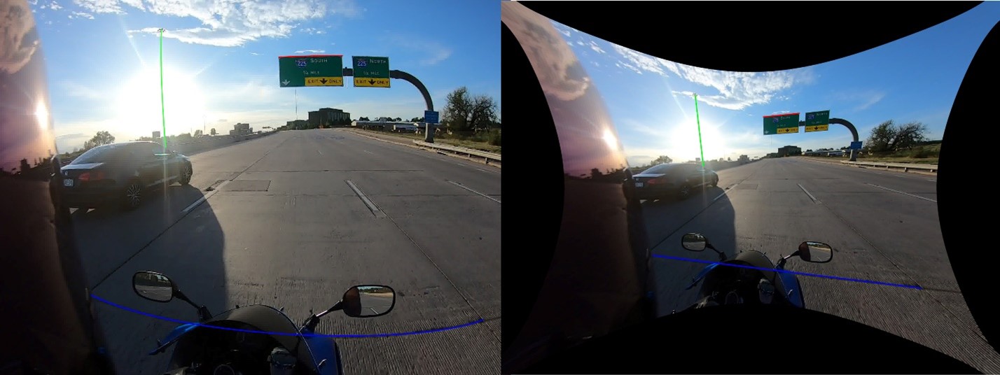 Figure 2: Graphic comparing the screenshots from the original video with the lens distortion (left) and with the lens distortion removed (right). Blue, green, and red lines highlighting road geometry, light post and road signage that should be straight in real life but are curved in the original video.