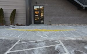 The curb ramp did not span the entire width of the accessible route, resulting in an elevation change of 5″ in the accessible route. We determined that the appropriate and reasonable design for the accessible path would have been to utilize a perpendicular curb ramp.