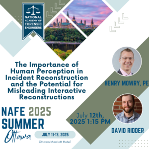 Vice President of Engineering, Hank Mowry, P.E., DFE, and Forensic Visualization Expert, David Ridder, have been selected to present at the National Academy of Forensic Engineers Summer Conference.